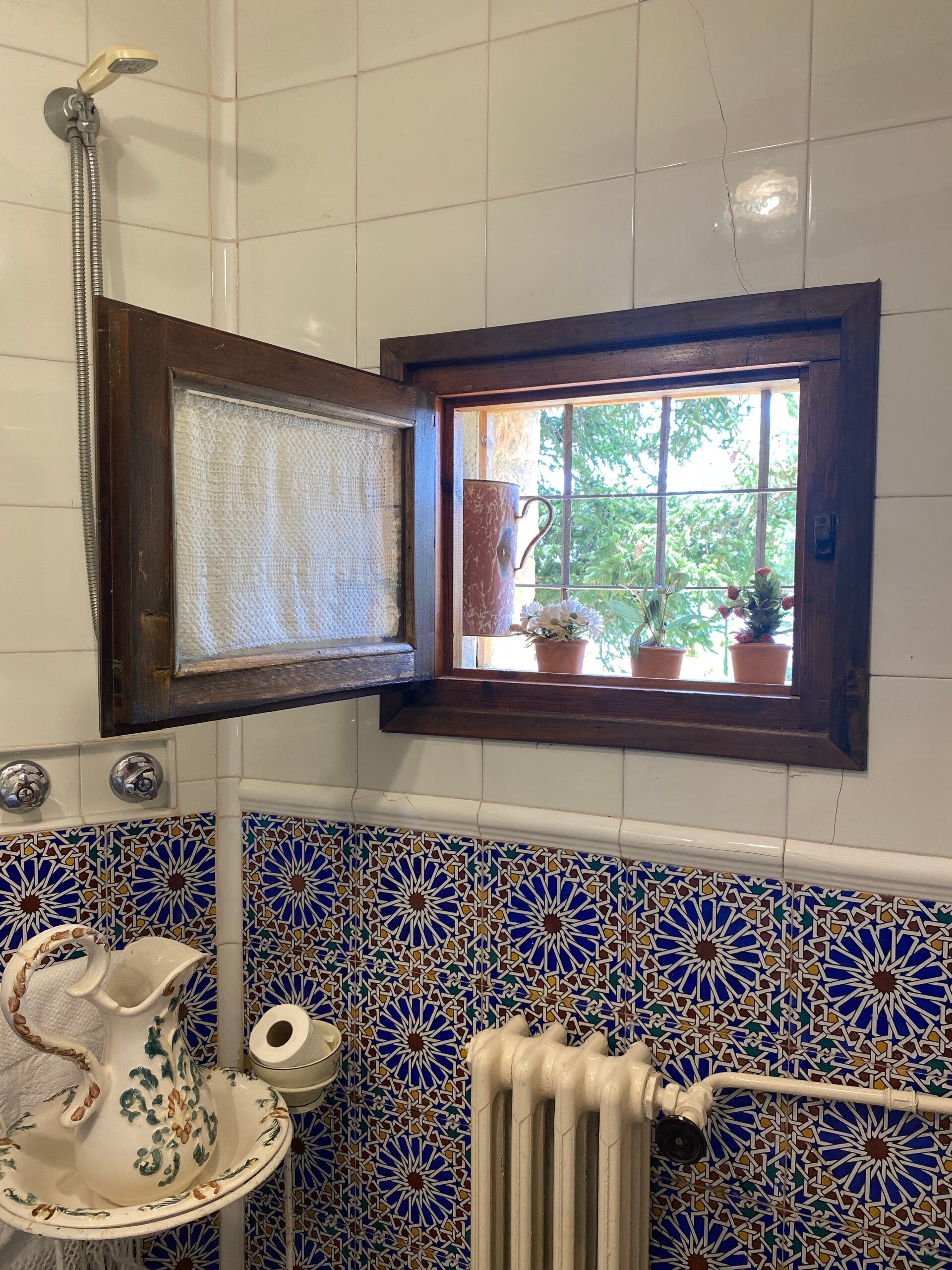 La casa cuenta con dos baños completos, uno de ellos en suit, y además un aseo en la planta inferior. En verano una ducha exterior en la zona del jardín.